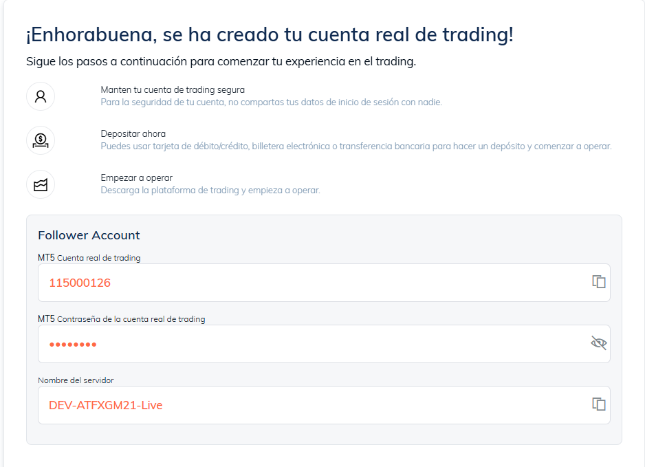 Una vez creada la cuenta, la página mostrará las credenciales de su cuenta de CopyTrade y la información del servidor. Conserve esta información de forma segura.